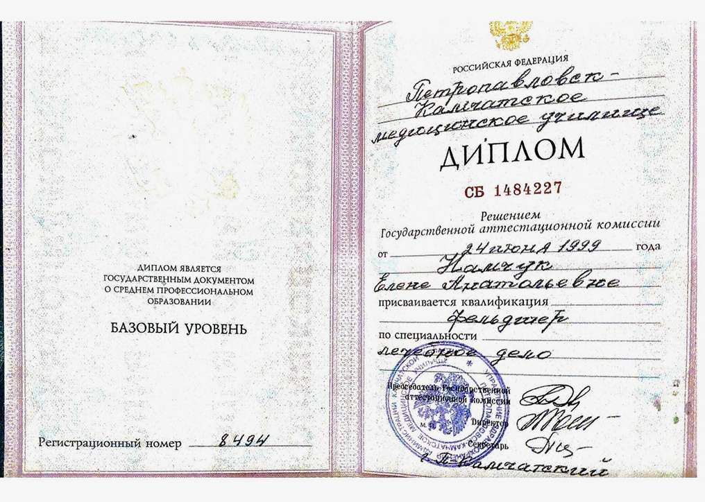 - Базовое образование - 1999 - Петропавловск-Камчатское медицинское училище