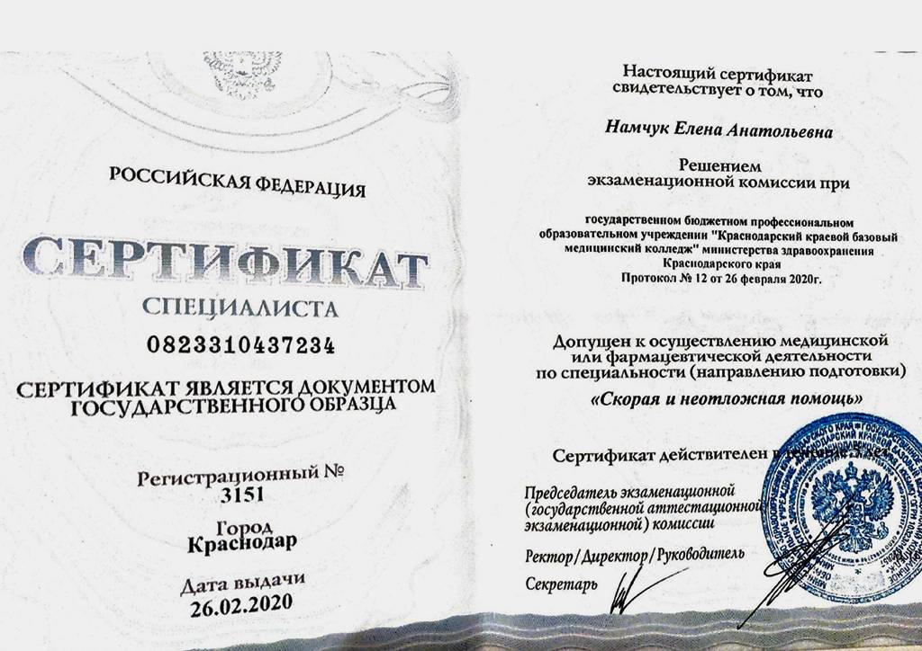 - Сертификат специалиста - 2020 - Краснодарский краевой базовый медицинский колледж